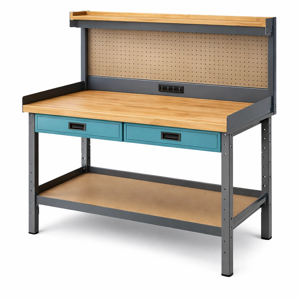 Banco de trabajo de acero con superficie de madera y cajones de metal 120x60x150 cm
