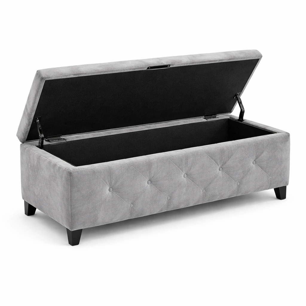 Este banco de almacenaje está tapizado en tela de poliéster con acolchado de espuma, ofreciendo una estructura resistente. Presenta una capacidad de almacenamiento en su interior y puede usarse también como asiento. El banco mide 140 cm de longitud, 45 cm de anchura y 40 cm de altura. Su color Gris se adapta a varios estilos de decoración.